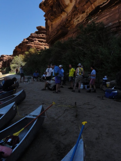 The chance to stretch our legs and raise our arms was just as welcome as advertised and those of us who made the trek got the views that were worth the effort. We did not find any dead horses, but were glad to have Turk’s hats on our heads, or any covering for that matter. The temperature spiked to near 100 on the mesa top. The cliffs in the distance were spectacular. We snapped some photos, rehydrated, and hurried back to the river.