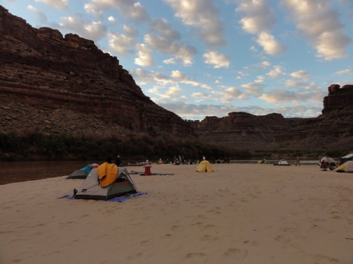 The second to last night in the canyon we had a beautiful vista down river toward the Confluence. A few bold paddlers decided to sleep without a tent under the stars. With dinner the Rystrom’s provided us with a special adult beverage selection. There were smiles all around. The pillow felt particularly soft that night until about midnight. What we had not anticipated was a storm. It began quickly, after we were securely in bed. The wind was intense enough to blow tiny particles of sand and grit into every part of our tents. Those without tents had to quickly scramble to set up shelter. Those with tents already up had to make sure that they did not blow over or roll away. Easier said than done. This night turned out to be the least comfortable for all of us. No one escaped the pelting of rain and wind and by dawn everyone discovered sand in every section of our packs and in every orifice of our bodies.