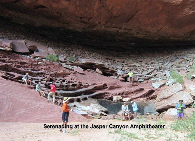 Perhaps the best hike that most of us made was the climb up Jasper Canyon and into the enormous natural Amphitheatre. The echo chamber was perfect for the singing of the SJSU men’s choir to serenade us with a few old favorites from Homecoming. It was a great place to sit in the shade, feel some refreshing water seeping down the rocks, and to see the holes that were created in the sedimentary surface. Great find!