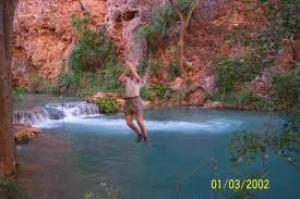 When we got there we stood at the precipice and gawked: we were staring at a Blue Paradise! Ahead of us was a 30’ waterfall that fell noisily into an azure pool with a lip of travertine around its edge. People were jumping from a spot above the falls and into the depths. Without hesitation Tom turned, handed me his camera and said, take a picture of this! I thought he was going to “moon me,” but instead he dropped his day pack and dashed over to the edge to jump in. I caught a picture of him in mid-flight. Tom came back and took a picture of me and we then swam in the pools, lazily ate lunch, sunned on the rocks, and chatted with our fellow Beaver Falls trekkers. The bottom of the pools was sandy and the sandwiches tasted good as we took in the beauty of this sublime oasis in the wilderness.