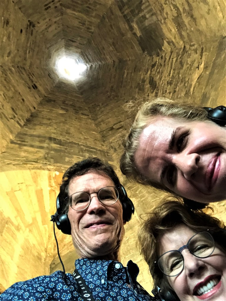 Today we parked along a hillside, then hiked for about a mile for an optimal view. However, mostly we drove our rented Fiat and took in the magnificent views. The narrow road was extremely curvy, so my eyes were fixed on the roadway as the cars were coming towards us. Navigating took a lot of energy. Margaret and Henry were taking photos and videos from their open windows! Of course, Henry spotted lots of birds and trees, made notes for his travel journal and, always the teacher, quizzed Margaret and me on what we saw.
