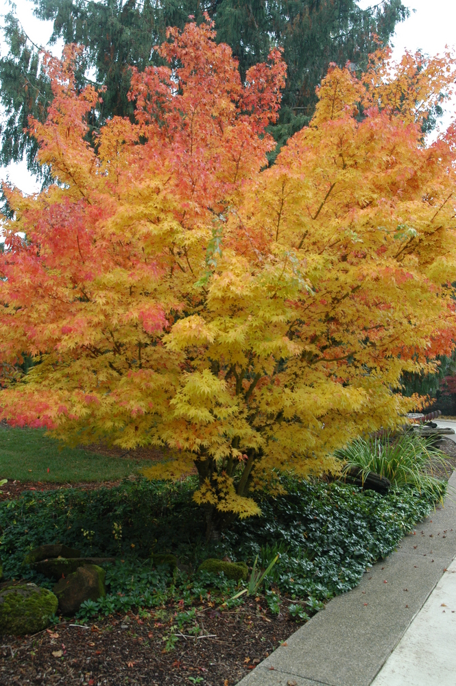 In spring and summer the foliage present deeply cut, pale green leaves that display attractive red margins. Come fall, the leaves turn a vibrant, golden yellow and pink. This garden gem thrives in bright dappled shade in warmer regions, or in full sun in cooler regions.