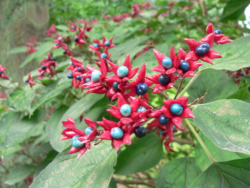 The word Clerodendrum comes from the Greek words klero (fate) and dendron (tree), however, the Pryhar sisters are right, the last four letters are d-r-u-m. The tree species comes from the Far East, native to China and Japan. In those countries the plant is most likely to be shrub or small tree, clipped to ornamental size for easier maintenance. The shrubs blossom in last summer, with showy fruit and “malodorous” leaves. On one website they say that when the leaves are bruised, they produce a unique aroma reminiscent of peanut butter. The tree also goes by the names Harlequin Glorybower and the Butterfly Bush. [1]
