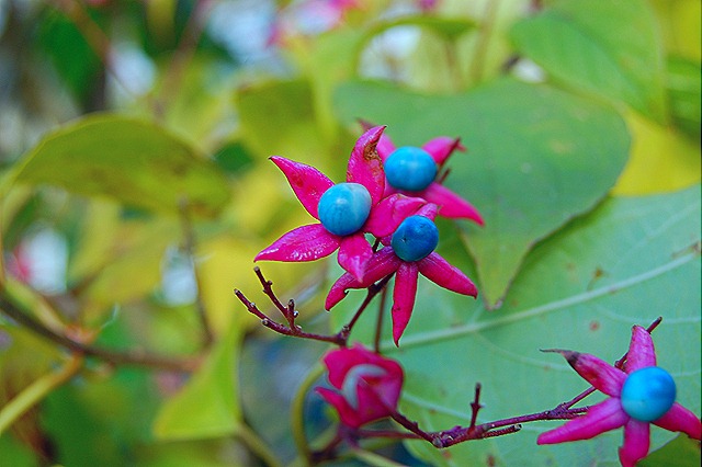 It is easy to love these trees for many reasons. One is that although the leaves tend to fall early in autumn, the blossoms continue to change well past Thanksgiving and into Christmas season. The flowers transform into small bright blue fruits and each fruit is surrounded by a bright red, fleshy calyx.