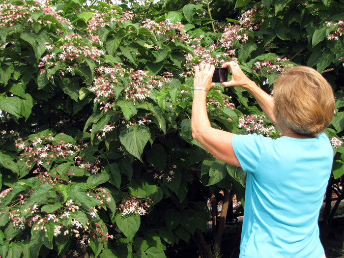 Our other side neighbors, the Pryhar sisters, told us that the tree was called a Clerodendrum. I repeated what I thought I heard after them: clerodendron. “No,” said Sherry Pryhar. “Not like rhododenDRON, but clerodenDRUM, like the percussion instrument!” So now I knew. Whatever the pronunciation, it smells great.