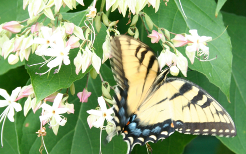 Months later, when we got a whiff of the blossoms, it became apparent what our neighbor was talking about. Steve smelled the fragrant flowers, which are late summertime magnets for hummingbirds, butterflies and insects. The flowers are delicate clusters of slender, tube-shaped white petals that dance above the canopy of grey-green leaves. The blossoms turn various shades of cream and pink and white and, as Billy Crystal might remark, “They smell marvelous.”