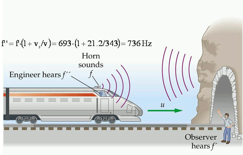 A common example of Doppler Shift is the change of pitch that we hear, when a train is heading toward us, and then there is a change in sound as it recedes from our location. It happens with ambulances, cars, horns, and other changing sources of sound. There seem to be three phases of the sound, 1) the sound as the source approaches, 2) the sound as it is upon you, and then 3) the sound as it is heading away. Compared to the emitted frequency, what we hear is a higher frequency during the approach, identical at the instant of passing by, and a lower frequency during the recession of the source.