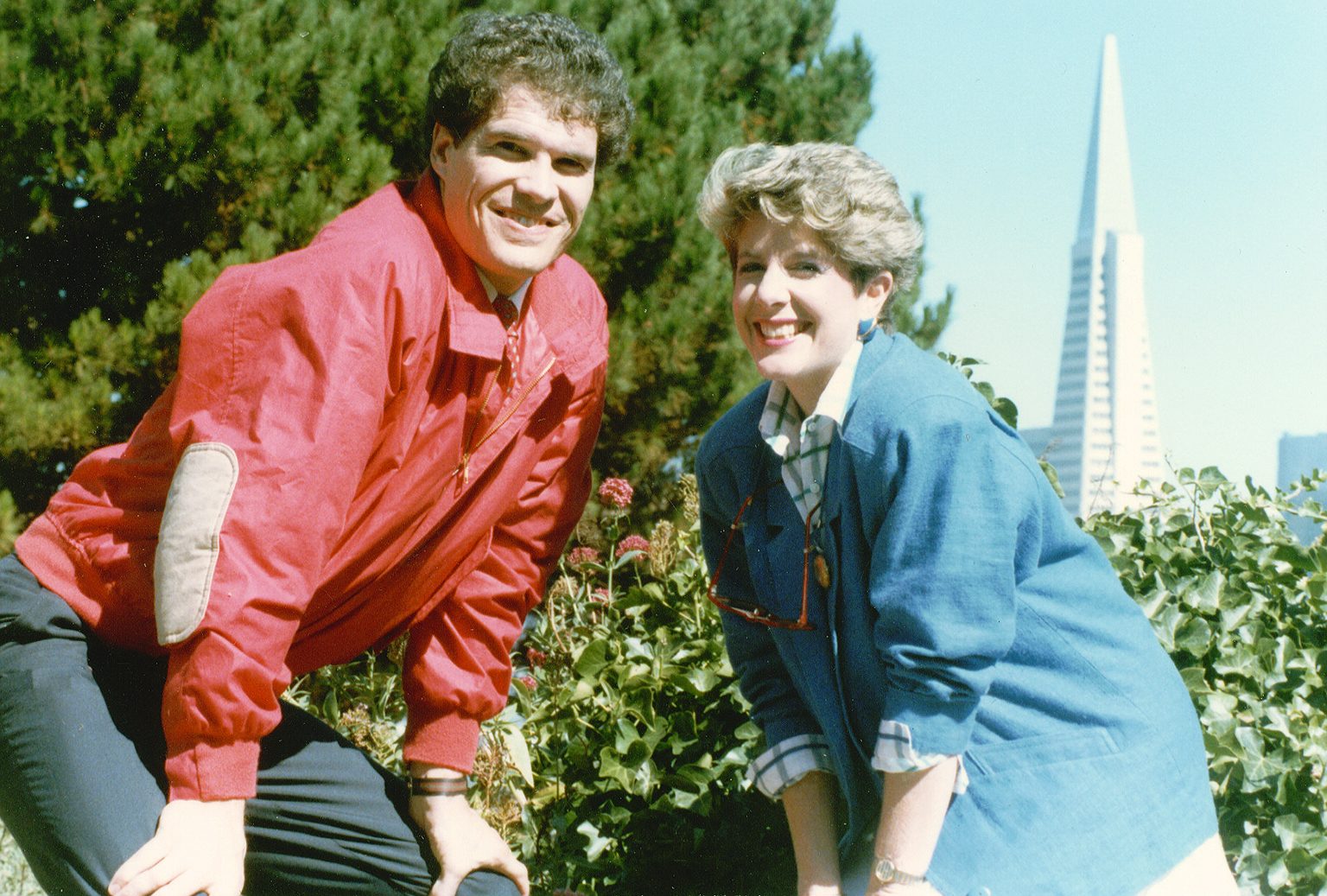 Henry & Tracy in San Francisco with the pine trees, ivies and pyramids