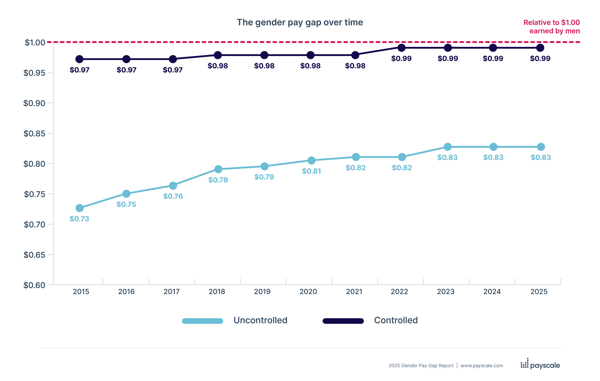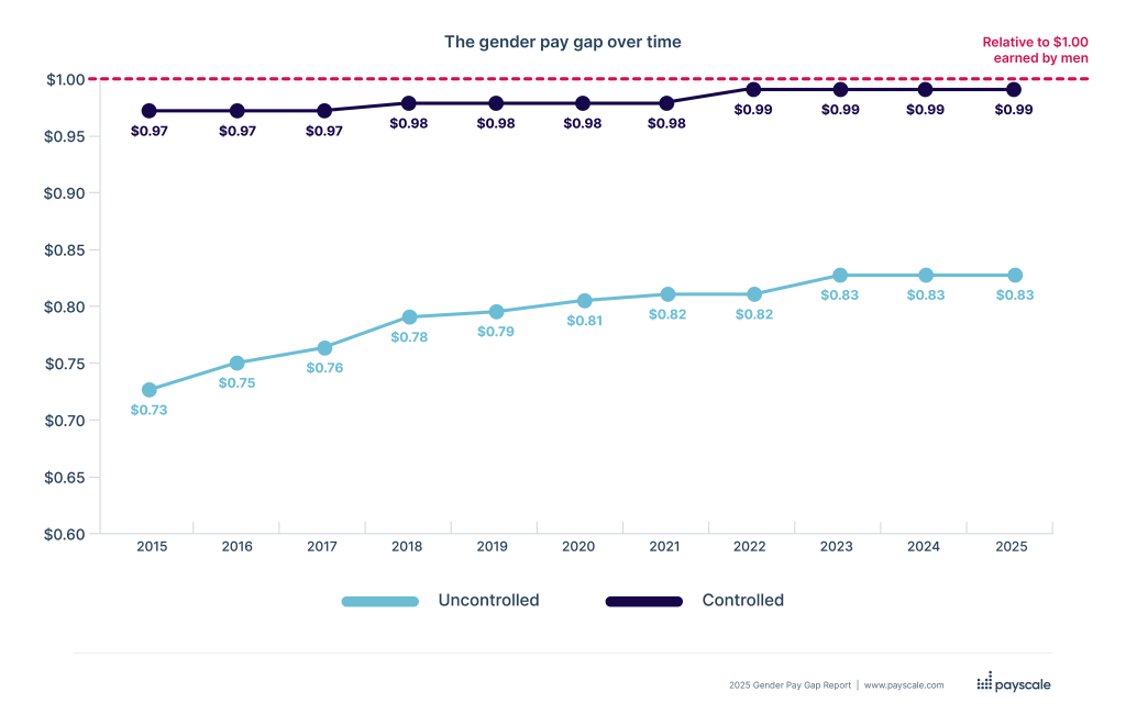 - Uncontrolled vs. controlled gap: The 83-cent figure is the “uncontrolled” or “unadjusted” pay gap, which compares the median salaries of all men and women. The “controlled” gap, which accounts for factors like job, experience, and education, is much smaller, with some reports placing it at about 99 cents to the dollar.