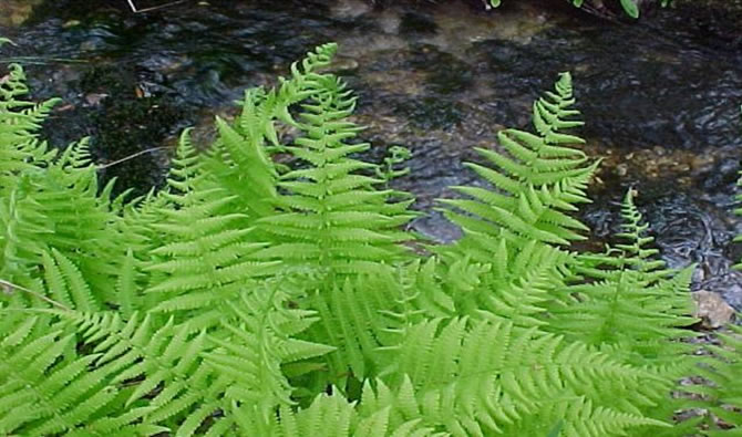 (Athyrium filix-femina) is one of the softest and most graceful native perennial ferns in the Northern forest. It is elegant and upright, reaching for two feet to five feet in height. The leaves are bright green, with a fine-textured lacy appearance. The single fronds measure up to one foot wide and three feet in length. They are native to the entirely of North America, from the continental US to Canada and Alaska.
