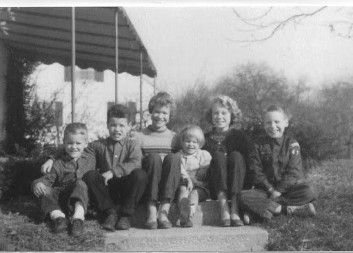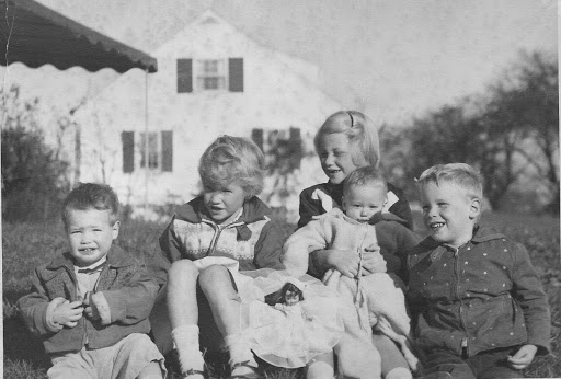 Mom was careful not to plant the flowers too close to the back stairs, because my brothers, sisters and I were fond of rolling down the hill. Rolling was a daily hazard for Laurie and me. My head bumps are a direct result of too many dizzying trips down the hill. In the picture above (I am on the left, pulling cut grass clippings from my jacket) Laurie is on the right, Millie and Eleanor are in the middle (with their prized doll between them), and our over-indulged little brother, Ned, sits in Eleanor’s lap.