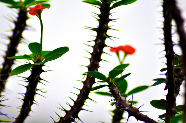 When we saw the piercing thorns of the actual desert plant called “Crown of Thorns,” we learned that the Pyracantha is a pussy cat and the Crown of Thorns is a panther. The thorns of the actual Crown of Thorns (above) are lethal and very dangerous to the ungloved gardener.