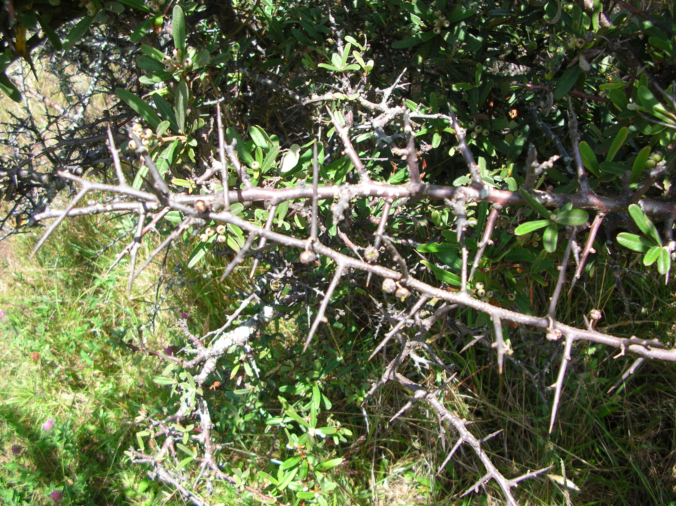 Seasonally the Pyracantha berries fall off in late fall or early the winter, during which the shrub looks much more bedraggled. And it is in late winter that the thorns, not covered by as many leaves and no berries, are the most visible. Weeding around them is not for the fainthearted.