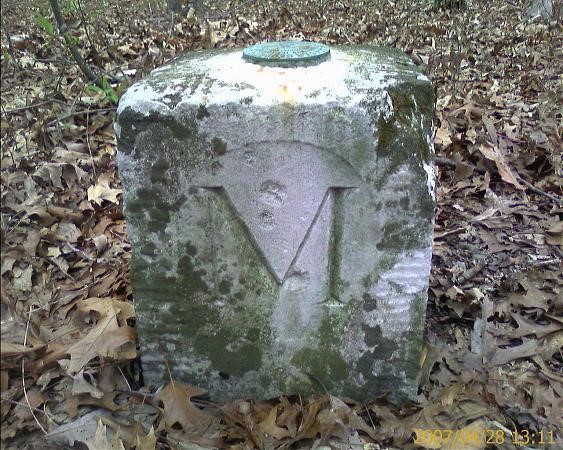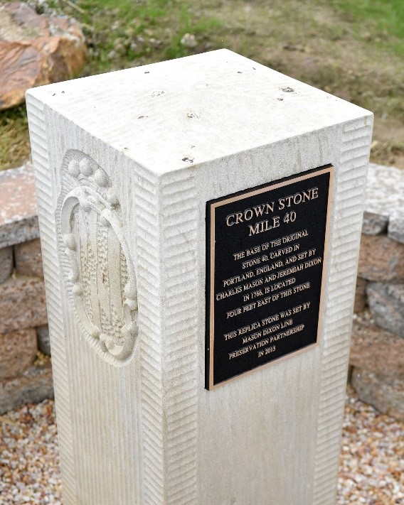 [5] A “crown-stone” boundary monument is a mile marker on the Mason–Dixon line. These markers were originally placed at every 5 miles (8.0 km) along the line. They were ornamented with family coats of arms facing the state that they represented: the coat of arms of Maryland’s Calvert family on one side and the Penn family on the other. Some stones simply have the letters M or P or D designating the state (Maryland or Pennsylvania or Delaware), which the crown stone faces.