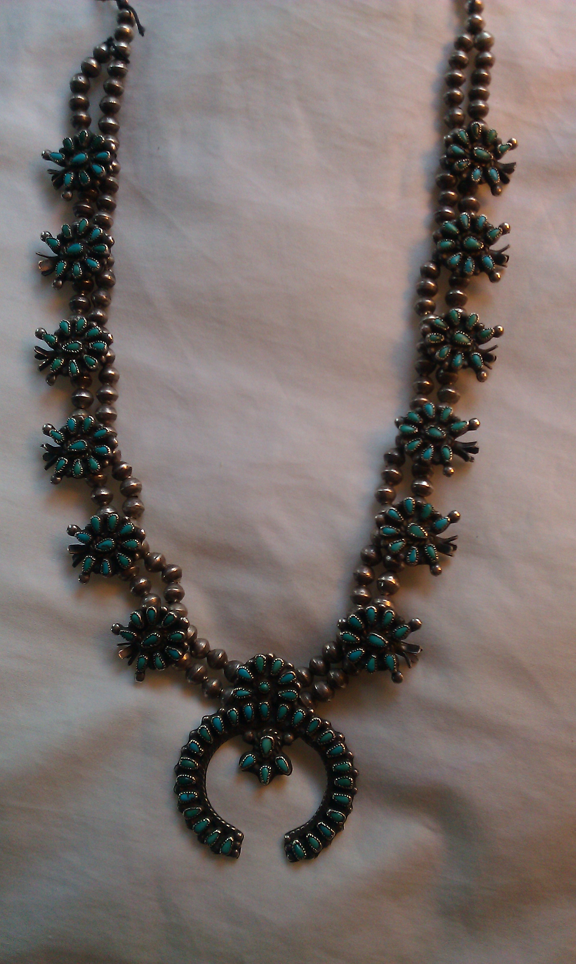 The name may have been mistranslated by the English or Spanish interpreters, because anyone who has examined a flowering squash would deny that the necklace resembles the blossoming vegetable; however, the name has stuck and become woven into the fabric of the jewelry, the land and the people.