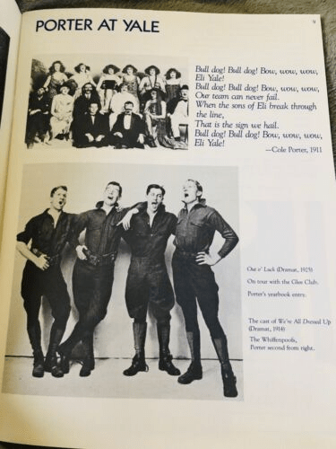 Porter was also heavily involved in extracurricular activities including music and cheerleading. During the football season he achieved an additional measure of campus fame for writing the fight songs, “Bull Dog” and “Bingo Eli Yale.” Porter added to his popularity by singing in the Glee Club, and writing suave, audacious musical comedy scores for the play (Cora and The Pot of Gold). Plays were often performed as part of the initiation ceremonies at his fraternity, Delta Kappa Epsilon (DKE), and for the smokers put on by the Yale Dramatic Association.