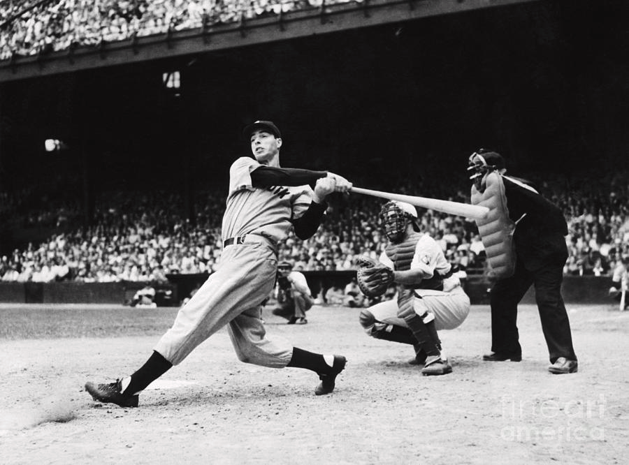 Joe DiMaggio hits his second homerun June 28, 1939 vs. Philadelphia Athletics. This image by Fine Art America is from the first game of the Yankees double-header with the Athletics.