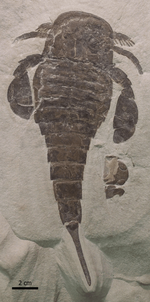 One of these fossils, which is perhaps the largest complete eurypterid ever discovered, is a specimen, 1.25 meters in length, of the giant pterygotid Acutiramus macrophthalmus, which will be on display when the Peabody re-opens to the public in 2024 after a multi-year renovation.