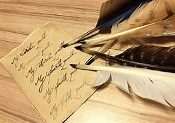 The skill comes in cutting the feather just so … making it comfortable and easy for fitting in your writing hand. The best techniques slice the feather so it can suck up enough ink to write a word or two without having to redip the pen too many times into the ink well.