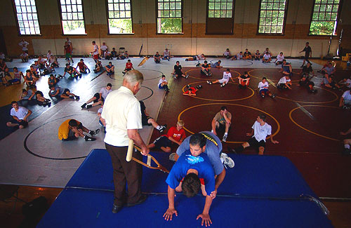 The two summers in the late 1960’s when we attended, the Granby clinics were conducted in a gym situated just steps from the beach. Although it sounds glamorous, as in “my vacation home — just steps from the beach,” the close proximity to the ocean also meant tons of sand. The prevailing winds blew in sand daily.  It was in our clothes, hair, shorts and teeth. Even on calm days, when the wrestlers had been warned to carefully remove their shoes, the sand still worked its way onto the mats and into our faces as they were mashed on a newly demonstrated wrestling move. Mighty gritty and rash inducing!