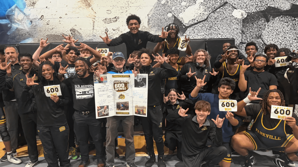 Seconds after Parkville wrestling secured its win over New Town in the third round of the Digital Duals, McNelis was surrounded. Teammates handed him slips of paper marked “600,” unfurled a poster signed by the team and chanted the number as they posed for photos — a celebration of his milestone 600th career victory.