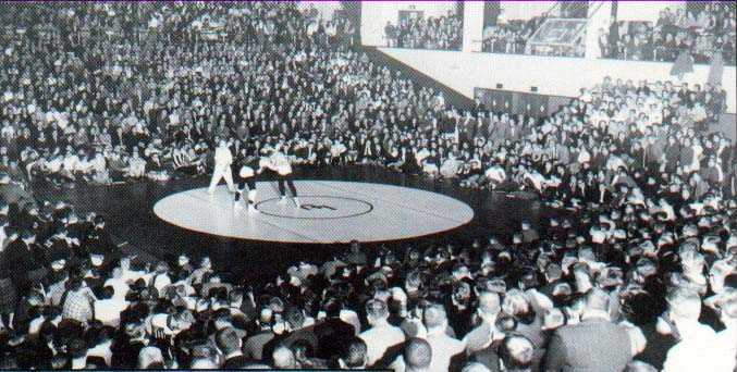 As a drum rolled, the announcer recited the pedigree of Mike Caruso: National Prep Champ at St. Benedict’s Prep, high school record undefeated, Lehigh record 135-1 with two EIWA and two NCAA trophies (at the time) … Etc. Etc.[1] Despite the recitation, Caruso had not appeared. Next, the crowd went suddenly silent, as the home team retreated back into the shadows. The cheerleaders and home town fans restarted their rhythmic clapping as the tension heightened. Ned and I could make out the sound of rolling wheels near the bleachers, but as people stood up and chanted, we were too short to see what was happening.